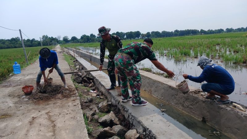 Anggota Satgas TNI Manunggal Membangun Desa (TMMD) ke-126 Kodim 0616/Indramayu terus kebut pengerjaan pembangunan Tembok Penahan Tanah (TPT) yang berlokasi di Blok Sigedang RT 001/RW 001, Desa Longok, Kecamatan Sliyeg, Senin (3/11/2025).
