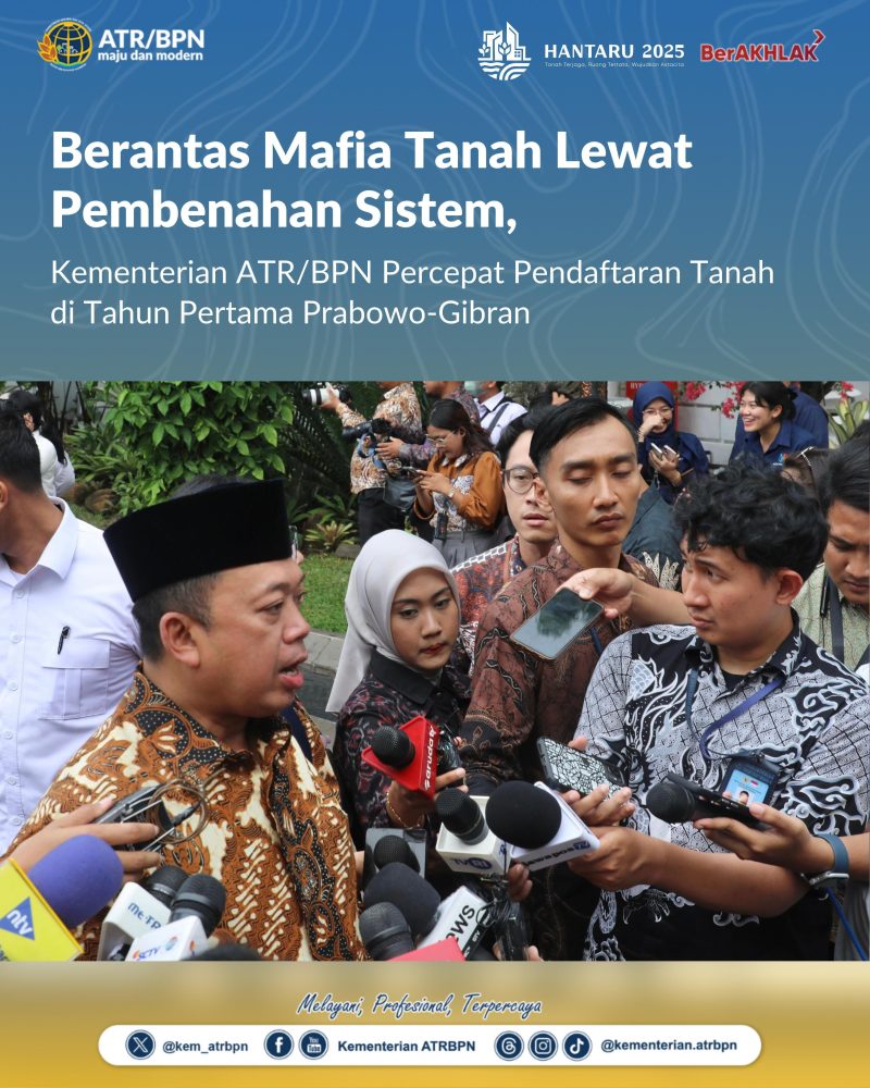 Jakarta – Kementerian Agraria dan Tata Ruang/Badan Pertanahan Nasional (ATR/BPN) melakukan pembenahan menyeluruh terhadap sistem layanan pertanahan untuk memberantas mafia tanah di tahun pertama Pemerintahan Prabowo-Gibran. Dengan perbaikan sistem internal, Menteri ATR/Kepala BPN, Nusron Wahid berharap celah praktik mafia tanah bisa ditutup. Hal itu dapat membantu pemerintah mempercepat pendaftaran dan penyertipikatan tanah.