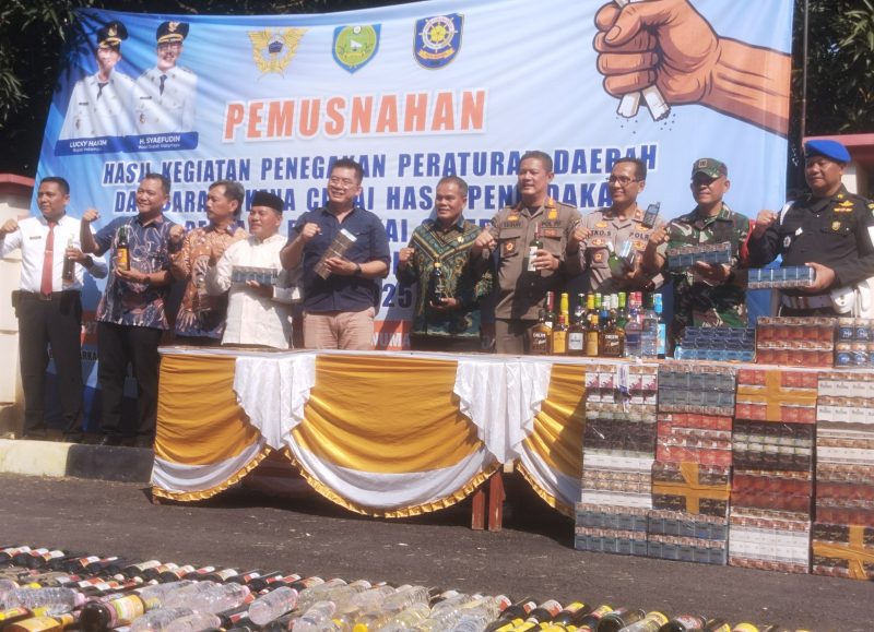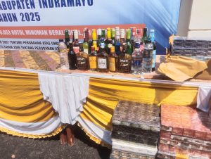 Sebanyak 10.053 botol minuman beralkohol, serta 310 liter tuak, ciu serta jutaan batang rokok ilegal dimusnahkan di halaman eks Gedung Wisma Haji Indramayu. pada Jumat, (10/10/2025).