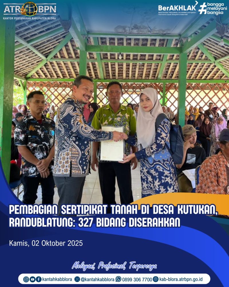 Pada hari ini, Kamis, 2 Oktober 2025, Kantor Pertanahan Kabupaten Blora melaksanakan kegiatan Pembagian Sertipikat Tanah untuk Desa Kutukan, Kecamatan Randublatung.