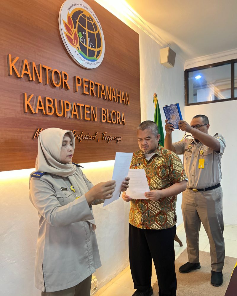 Blora, 20 Januari 2026 — Kantor Pertanahan Kabupaten Blora melaksanakan kegiatan pengambilan sumpah sertipikat hilang kepada Bapak Baskoro Aji, selaku salah satu ahli waris dari almarhum Suratno, terkait Sertipikat Hak Milik Nomor 00373 yang terletak di Desa Kemiri, Kecamatan Kunduran, Kabupaten Blora.