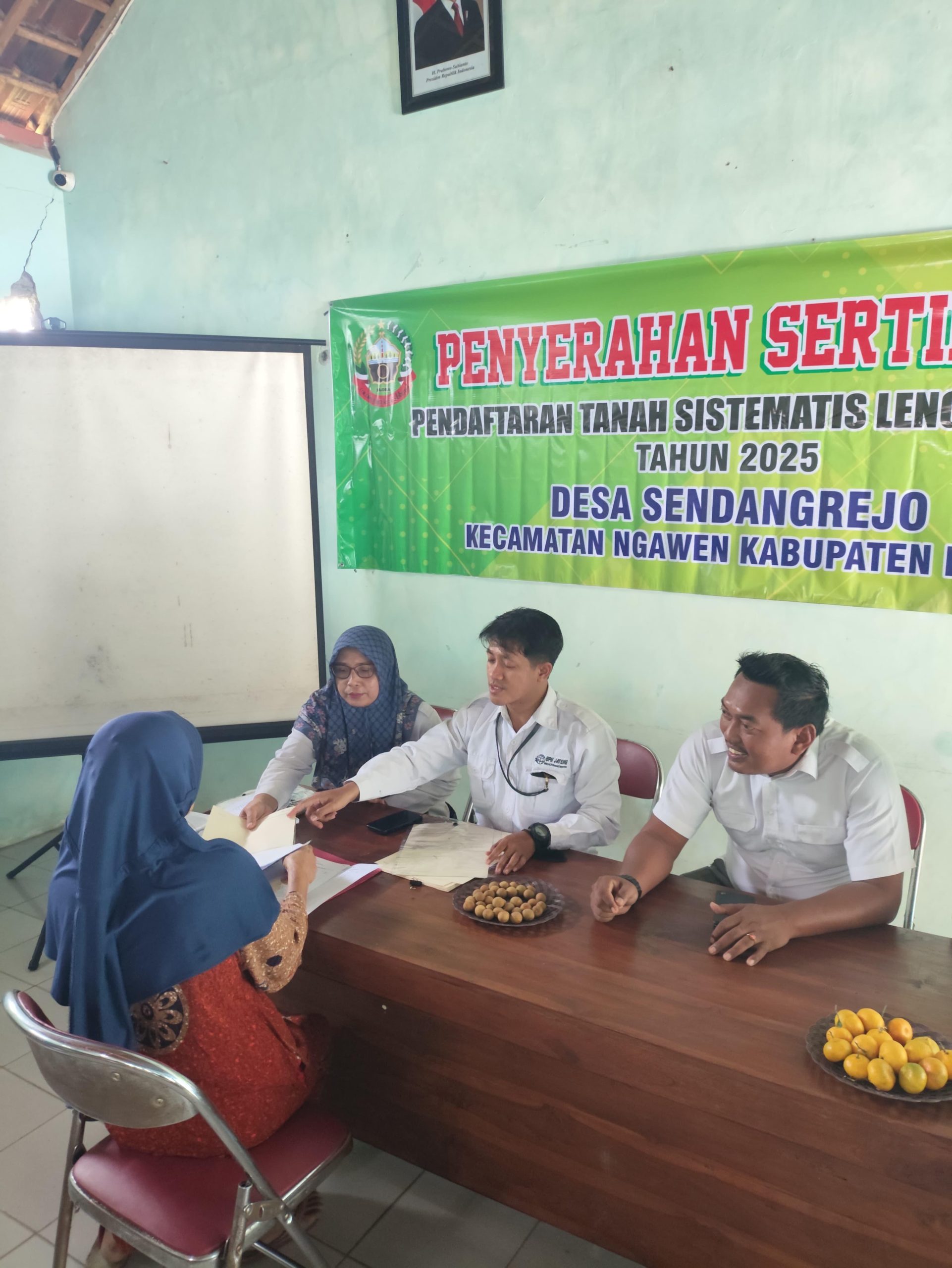 Kegiatan ini berlangsung di Kantor Desa Sendangrejo dan diserahkan bersama Kepala Desa Sendangrejo, Bapak Wiwik Suhendro. Hadir pula dari Kantor Pertanahan Kabupaten Blora, Bapak Sriyono, A.Ptnh., M.H. dan Ibu Dewi Ernawati, S.H. beserta staf Bapak Mohamad Faiz Nasrulloh, S.H.