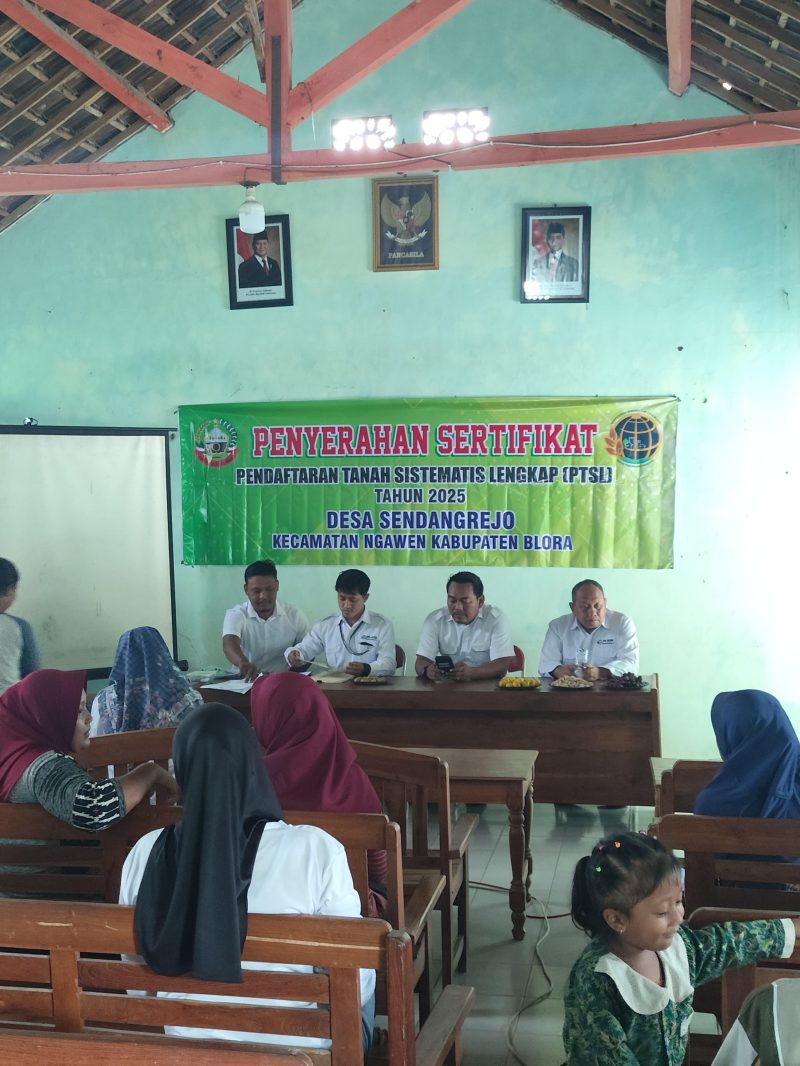 Blora, 05 November 2025 — Kantor Pertanahan Kabupaten Blora melaksanakan Penyerahan Sertipikat Program Pendaftaran Tanah Sistematis Lengkap (PTSL) di Desa Sendangrejo, Kecamatan Ngawen.