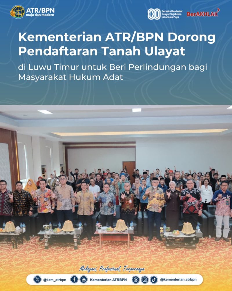Luwu Timur – Kementerian Agraria dan Tata Ruang/Badan Pertanahan Nasional (ATR/BPN) berupaya memastikan kepastian hukum dan perlindungan hak atas tanah bagi masyarakat hukum adat. Salah satu caranya dengan melakukan Sosialisasi Pengadministrasian dan Pendaftaran Tanah Ulayat berkelanjutan, seperti yang diadakan di Kabupaten Luwu Timur, Sulawesi Selatan pada Kamis (28/08/2025).