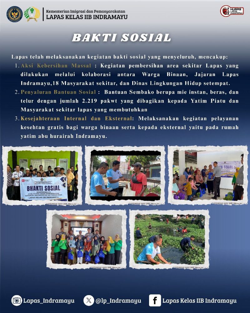 Lapas Indramayu juga menunjukkan kepedulian sosial melalui kegiatan bakti sosial yang melibatkan petugas, warga binaan, dan masyarakat sekitar.