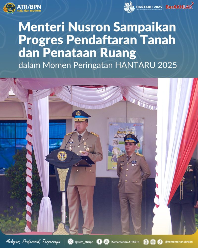 Jakarta – Pada 65 Tahun peringatan hari lahir Undang-Undang Pokok Agraria (UUPA), Kementerian Agraria dan Tata Ruang/Badan Pertanahan Nasional (ATR/BPN) terus menjamin pengelolaan tanah dan ruang bagi masyarakat, salah satunya melalui program Pendaftaran Tanah Sistematis Lengkap (PTSL). Hal ini diungkapkan Menteri ATR/Kepala BPN, Nusron Wahid, dalam Upacara Peringatan Hari Agraria dan Tata Ruang (HANTARU) 2025, Rabu (24/09/2025).