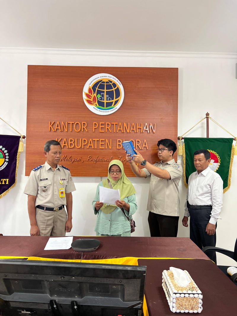 Blora, 03 November 2025 — Kantor Pertanahan Kabupaten Blora melaksanakan kegiatan pengambilan sumpah sertipikat hilang atas nama Trismiati, pemegang Sertipikat Hak Milik Nomor 00638 Desa Purworejo, Kecamatan Blora, Kabupaten Blora.