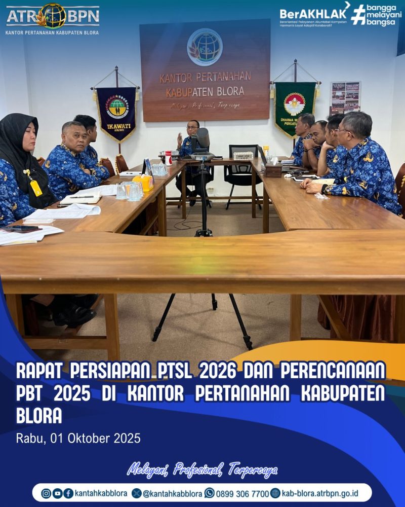 Blora, 1 Oktober 2025 – Kantor Pertanahan Kabupaten Blora pada hari ini menggelar rapat persiapan Program Pendaftaran Tanah Sistematis Lengkap (PTSL) Tahun 2026 yang dipadukan dengan perencanaan Pengukuran Bidang Tanah (PBT) Tahun 2025.