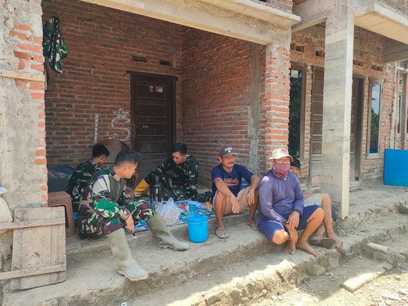 Di sela-sela kesibukan melaksanakan pembangunan rumah warga dalam program TNI Manunggal Membangun Desa (TMMD) ke-126, Praka Leno bersama dua orang anggota Satgas TMMD melaksanakan kegiatan komunikasi sosial (komsos) dengan warga setempat di Blok Siwalan RT 12/RW 04, Desa Longok, Kecamatan Sliyeg, Kabupaten Indramayu. (14/10/25).