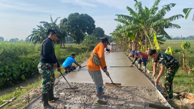 Anggota Satgas TNI Manunggal Membangun Desa (TMMD) ke-126 Kodim 0616/Indramayu bersama masyarakat setempat terus melanjutkan pengerjaan pengecoran rabat beton di Blok Sicendol, Desa Longok, Kecamatan Sliyeg, Kabupaten Indramayu, Jumat (31/10/2025).