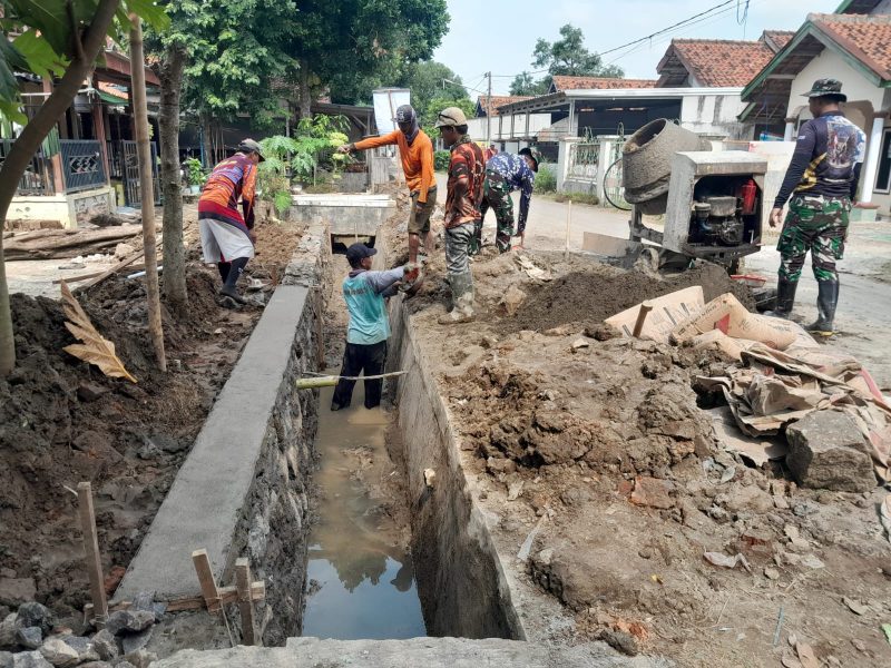 Anggota Satgas TMMD Ke-126 Kodim 0616/Indramayu terus melanjutkan pembangunan saluran drainase di Blok Desa RT 01/RW 03, Desa Longok, Kecamatan Sliyeg, Kabupaten Indramayu, Selasa (21/10/2025).