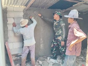 Anggota Satgas TNI Manunggal Membangun Desa (TMMD) ke-126 terus melanjutkan kegiatan pembangunan Rumah Tidak Layak Huni (Rutilahu) milik Ibu Dunia yang berlokasi di Blok Siwalan RT 014/RW 005, Desa Longok, Kecamatan Sliyeg, Kabupaten Indramayu.