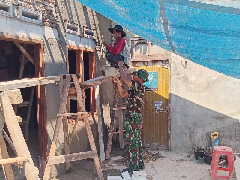 Anggota Satgas TNI Manunggal Membangun Desa (TMMD) ke-126 terus melanjutkan kegiatan pembangunan Rumah Tidak Layak Huni (Rutilahu) milik Ibu Dunia yang berlokasi di Blok Siwalan RT 014/RW 005, Desa Longok, Kecamatan Sliyeg, Kabupaten Indramayu.