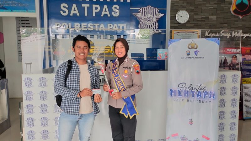 Polantas ( Polisi Lalu Lintas) Polresta Pati Menyapa” Duta Pelayanan Satpas memberikan kepada pemohon SIM yang tertib dalam administrasi. Pemberian hadiah tersebut guna untuk mendorong dan menyemangatkan kepada masyarakat agar peduli dalam pengajuan pembuatan SIM yang berguna sebagai pelengkap Pemotor.