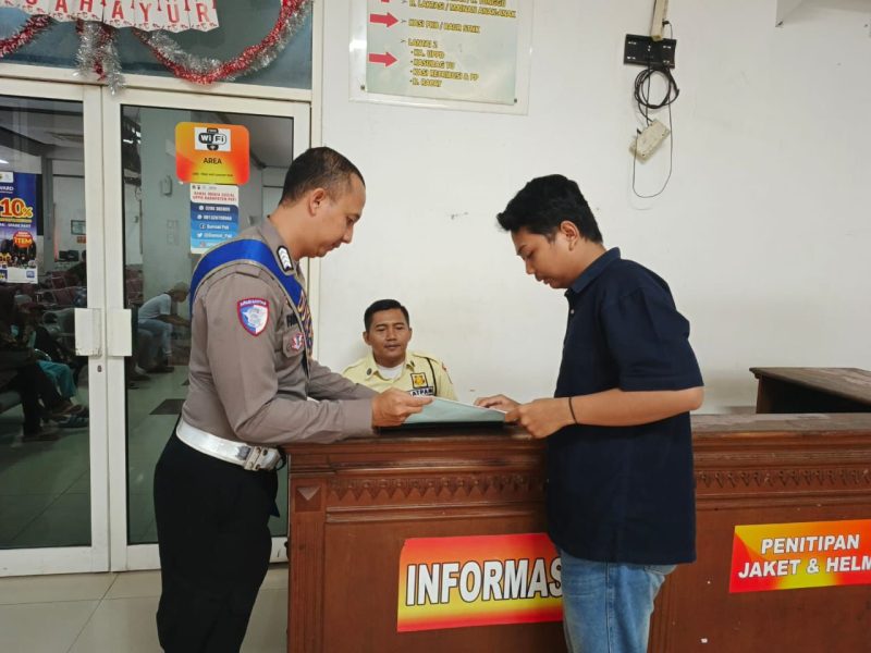 Dengan sikap yang humanis dan komunikatif, terlihat personil anggota Satlantas Polresta Pati sedang memberikan penjelasan kepada wajib pajak. Sabtu 3 Januari 2026.